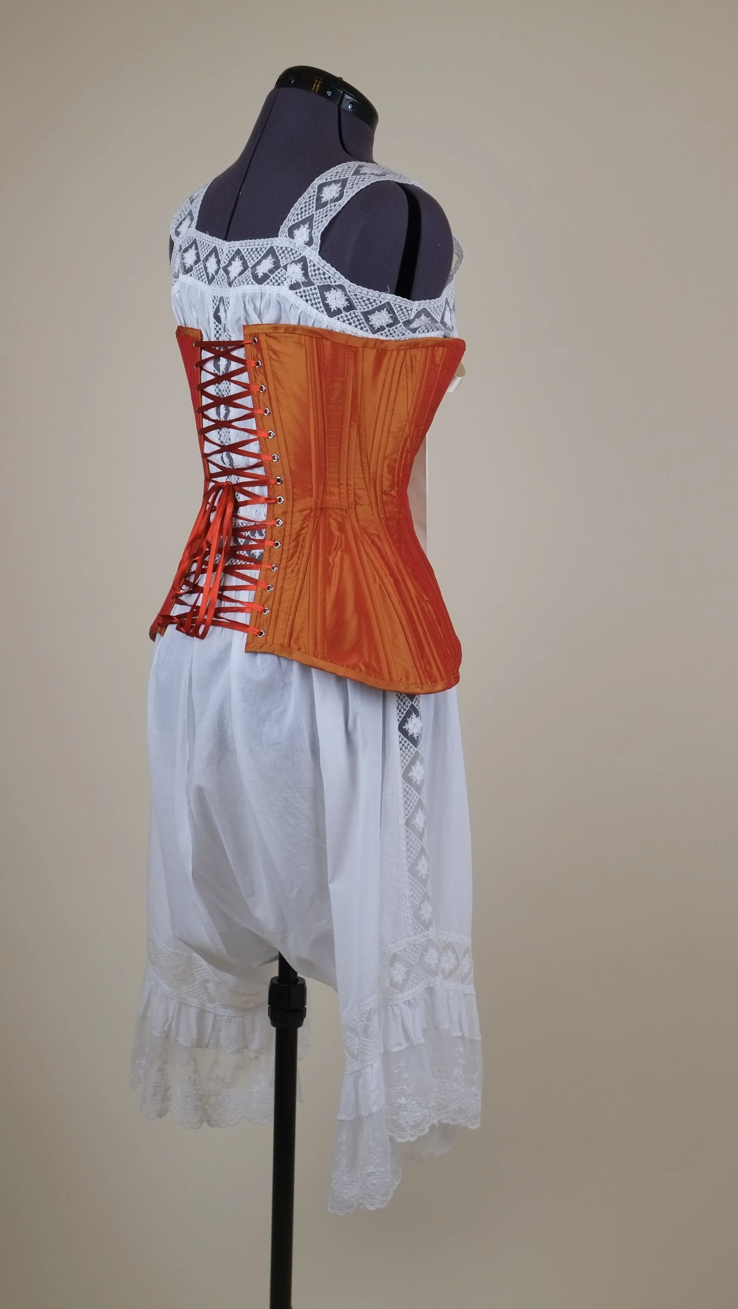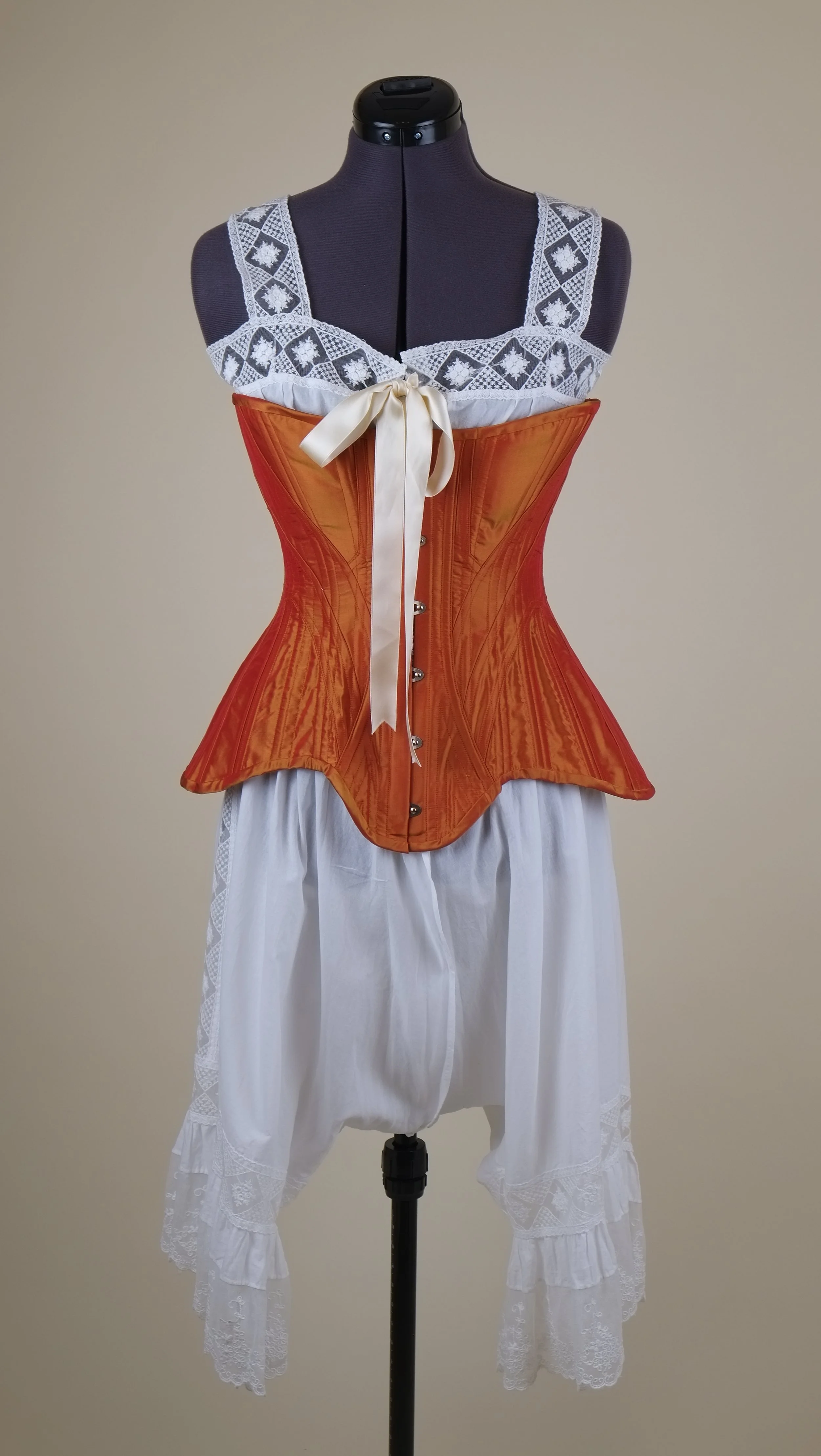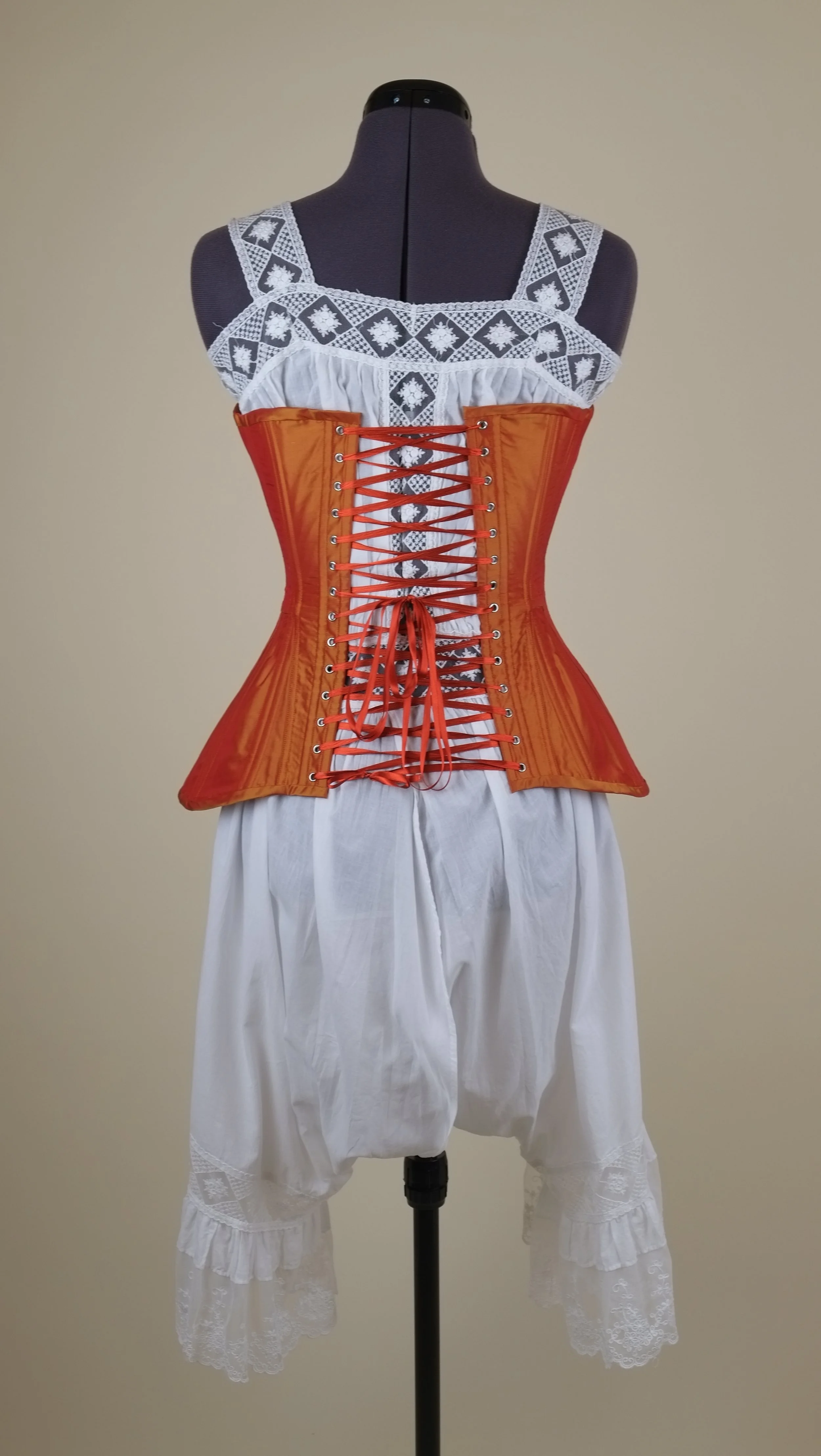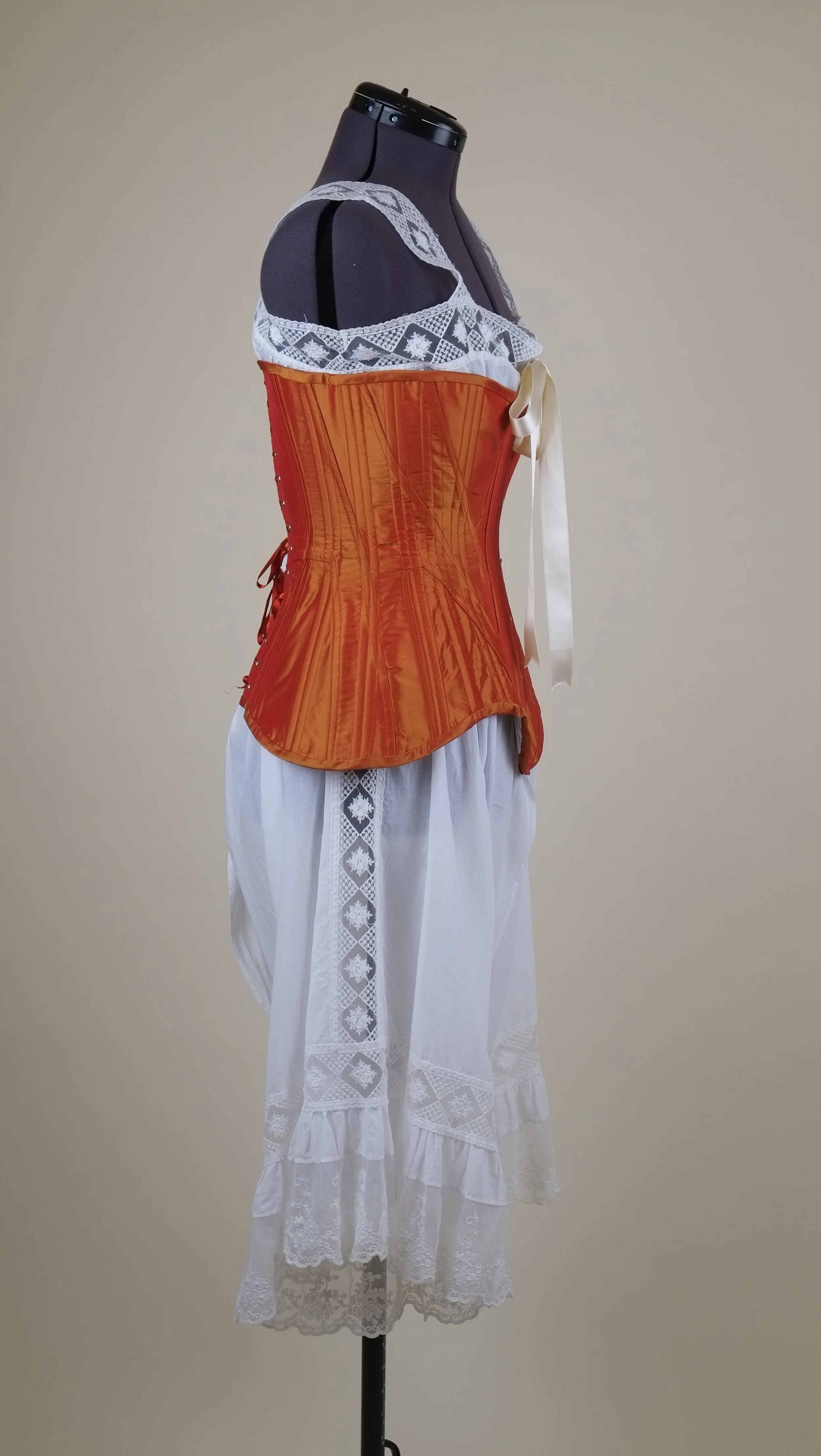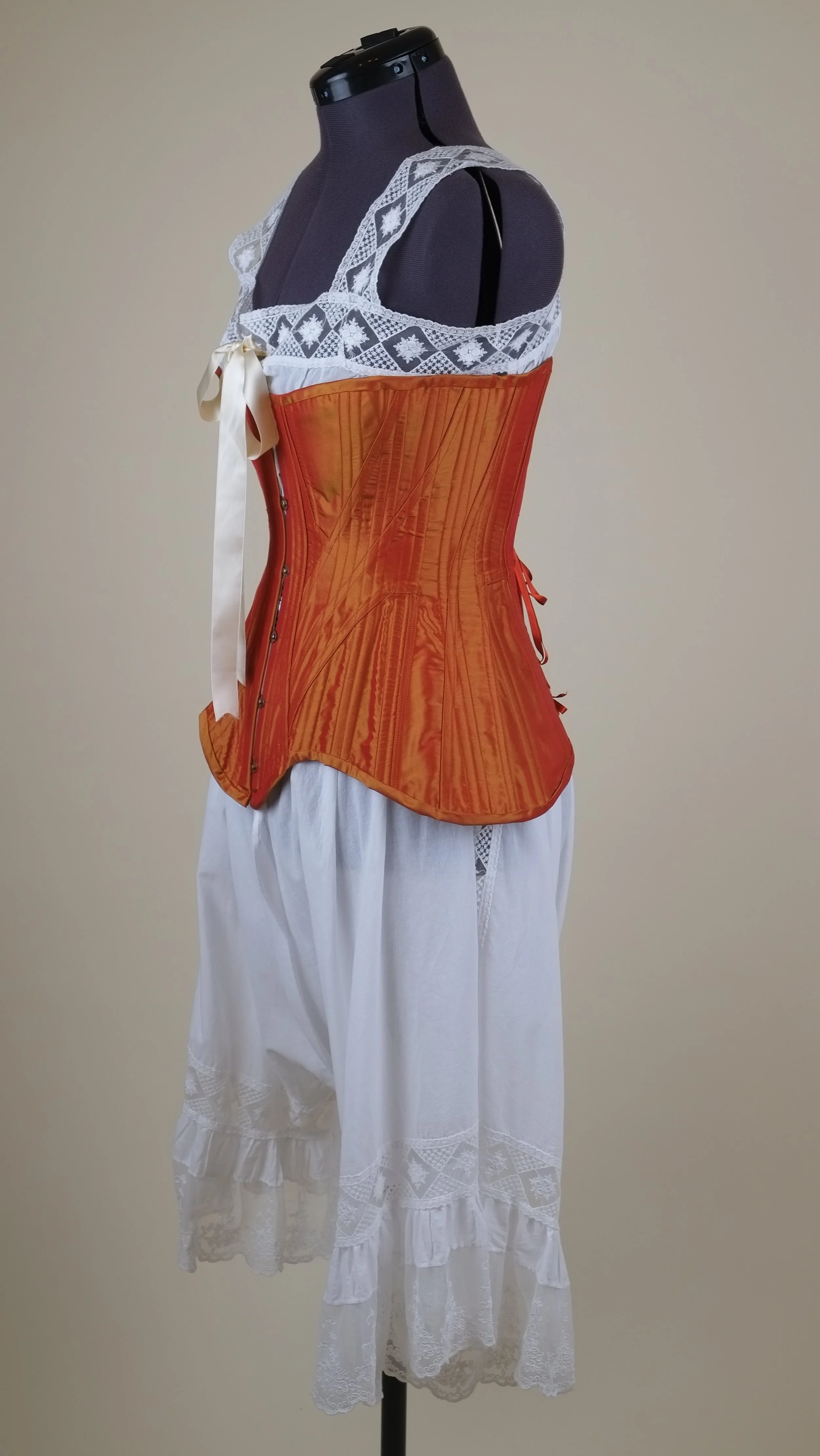 Häufig bestehen Korsetts aus dieser Zeit nur noch aus einer Lage Stoff, da ich allerdings diesen Rest eines gelb-rot changierenden Seidentafts verwenden wollte, musste ich etwas von der gängigen Norm abweichen. Der Taft allein war nicht stabil genug, um den Zug der Schnürung auszuhalten, also habe ich Coutil verwendet, der aber mit dem Taft verbunden und so als eine Lage Stoff verarbeitet worden ist. Das Korsett ist mit synthetischem Fischbein verstärkt und wird auf der Rückseite durch Metallösen geschnürt.