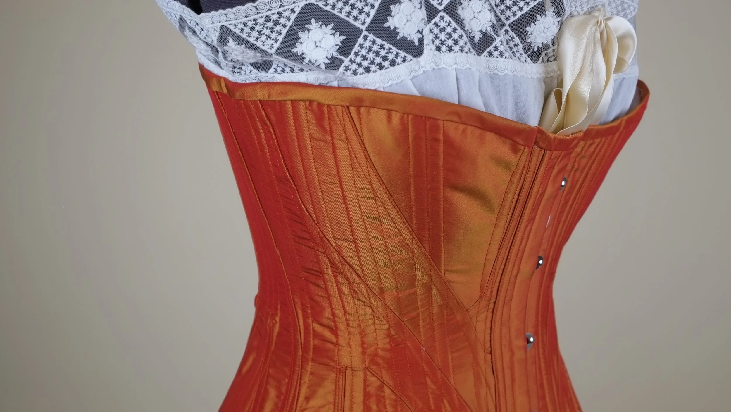 Die Korsetts der 1890er Jahre unterscheiden sich nur optisch nur leicht von ihren Vorgängern. Um die besonders kurvenreiche Stundenglas-Figur zu formen, besteht das Korsett aus vielen Einzelteilen. Der Metallverschluss an der Vorderseite ist löffelförmig und durch seine leichte Wölbung im Bereich des Bauches auch besonders bequem. Die formgebende Schicht ist wieder ein Baumwollcoutil mit einem zart apricot gefärbten Seidentaft. Über den Nähten der Einzelteile ist das Korsett mit dreireihigen Fischbeinkanälen verstärkt. An der Oberkante ist es mit etwas weißer Spitze verziert.