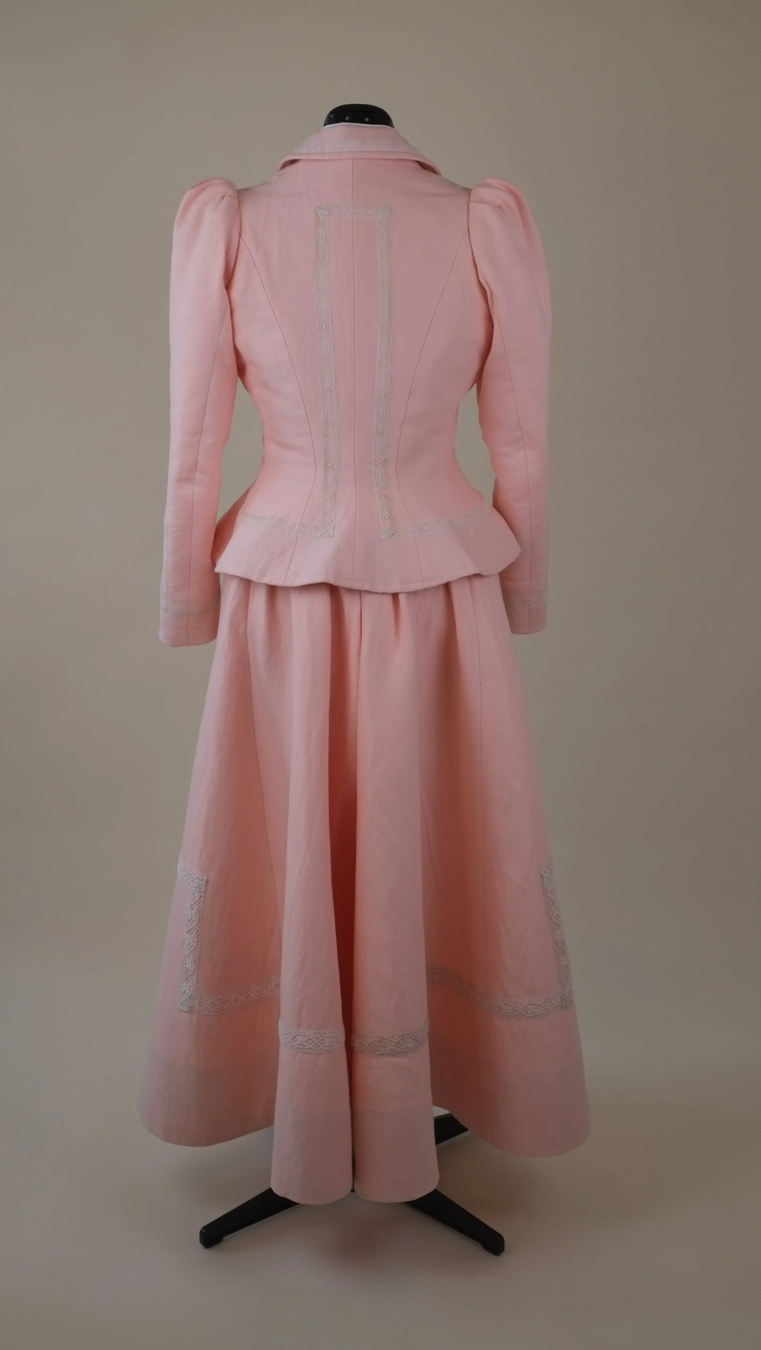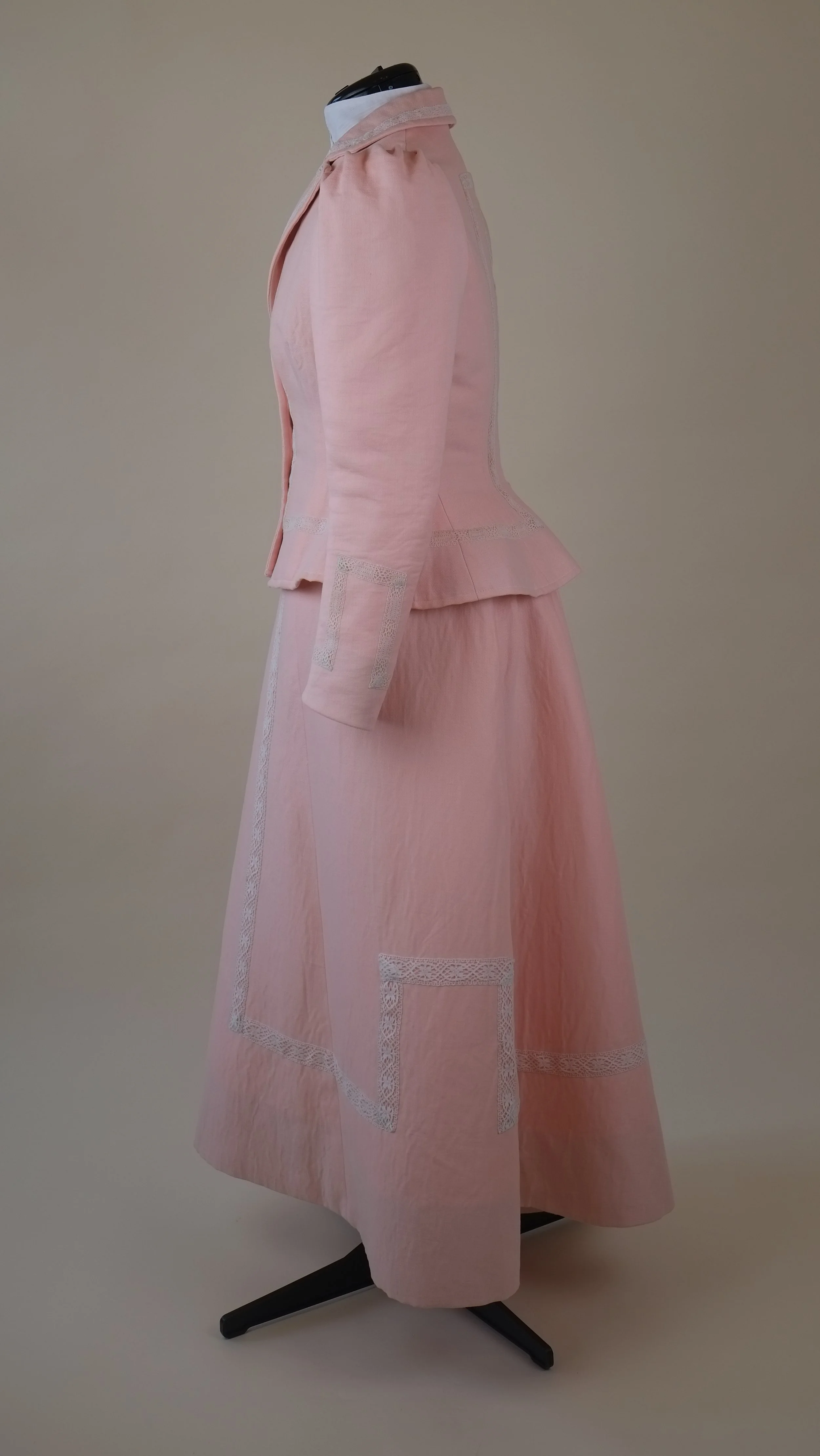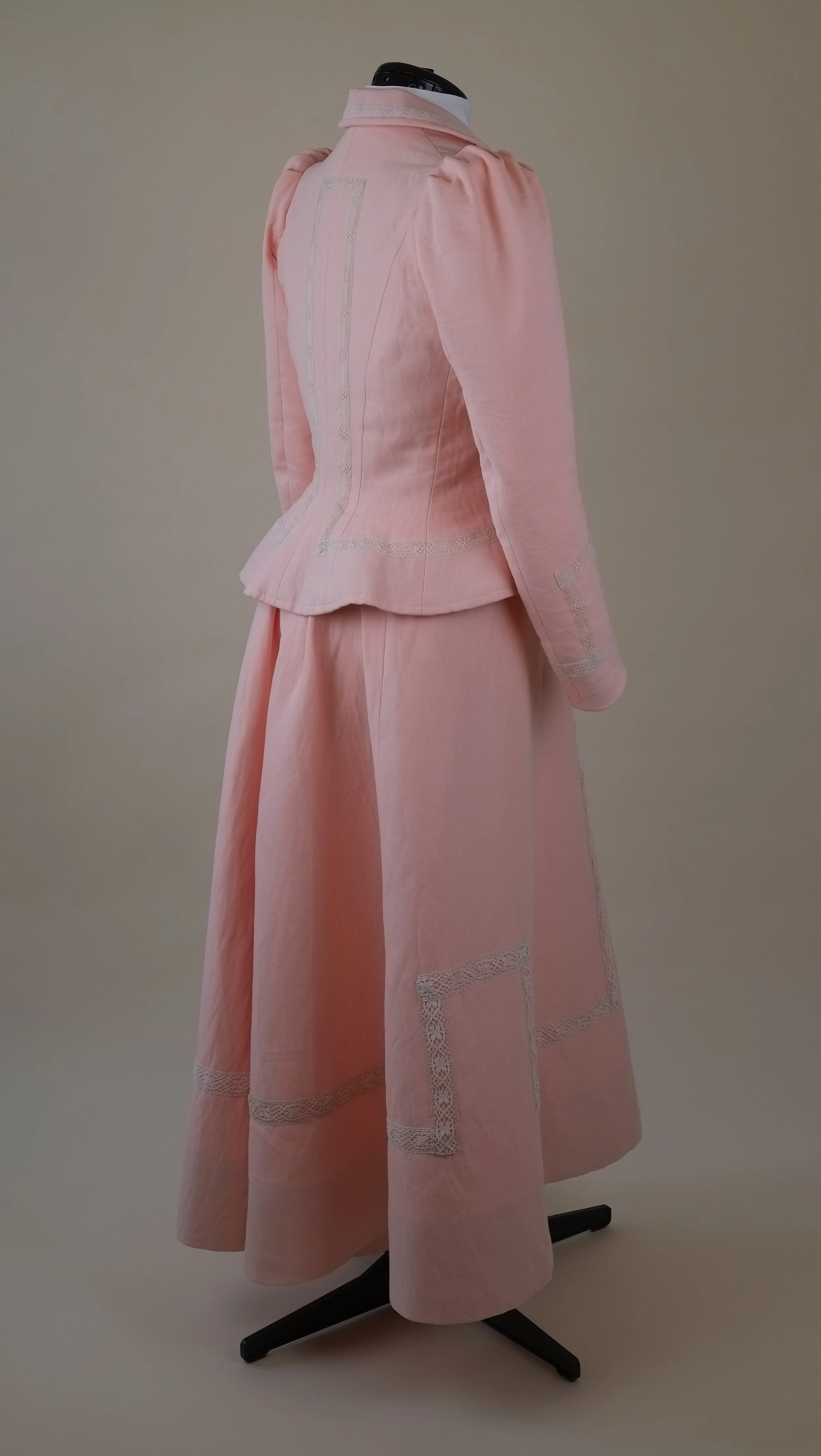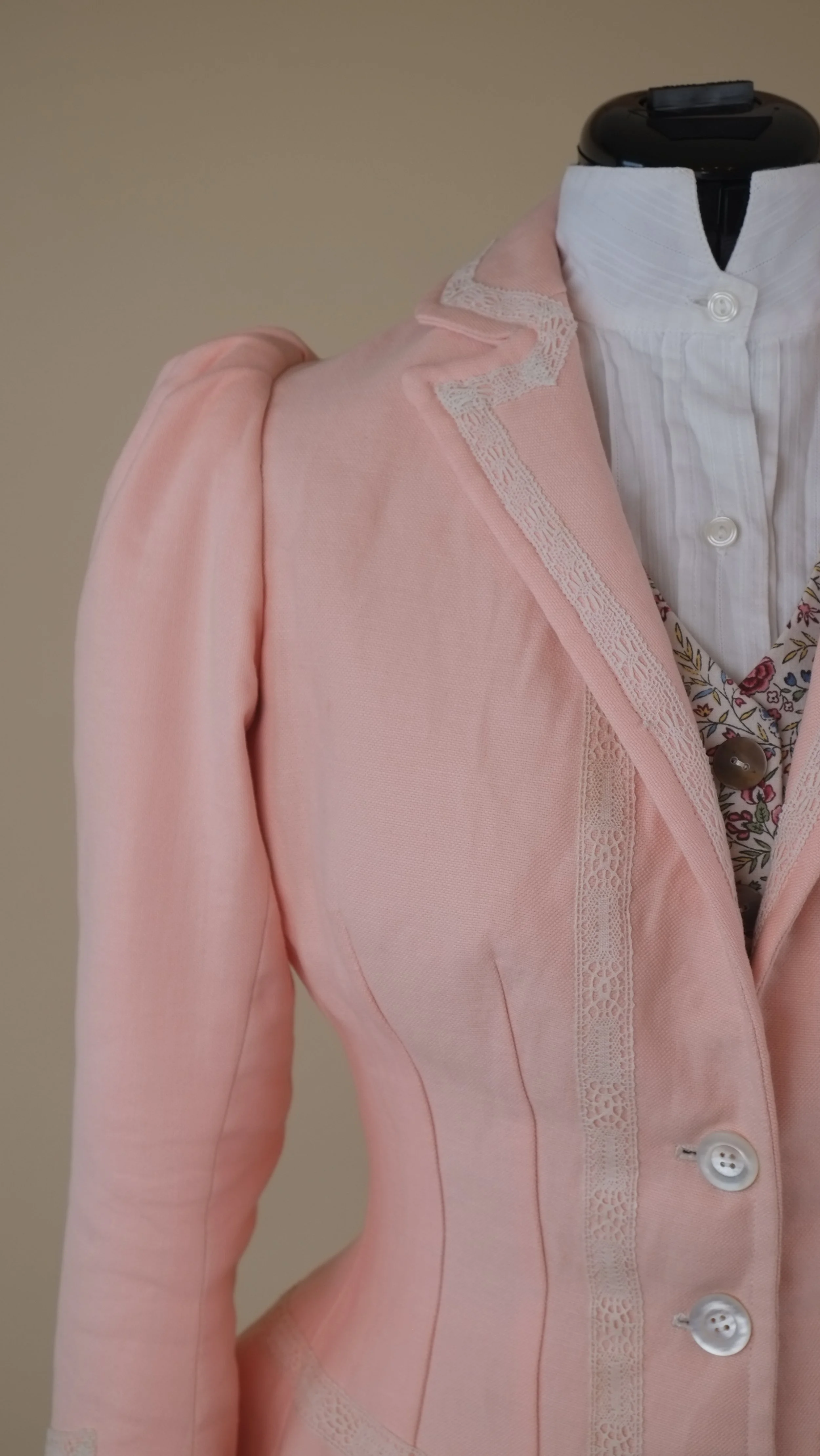 Bei den Jacken gab es eine Vielzahl verschiedener Stile zur Auswahl. Von kurzen offenstehenden bis hin zu wadenlangen Mänteln war alles zu finden. Ich habe mich hier für ein kürzeres Design entschieden. In meiner sommerlichen Variante eines Wanderensembles bestehen Jacke und Rock aus einem zart rosafarbenen Leinen. Beide Teile sind nur mit den nötigsten Verstärkungen und Polsterungen ausgestattet, um einen guten Sitz zu garantieren, ohne aber die Stücke allzu schwer zu machen. Die Weste und auch die Futterstoffe aller drei Stücke sind aus Baumwolle. Die Knopflöcher sind handgearbeitet und das ganze Ensemble ist mit antiker Spitze verziert.