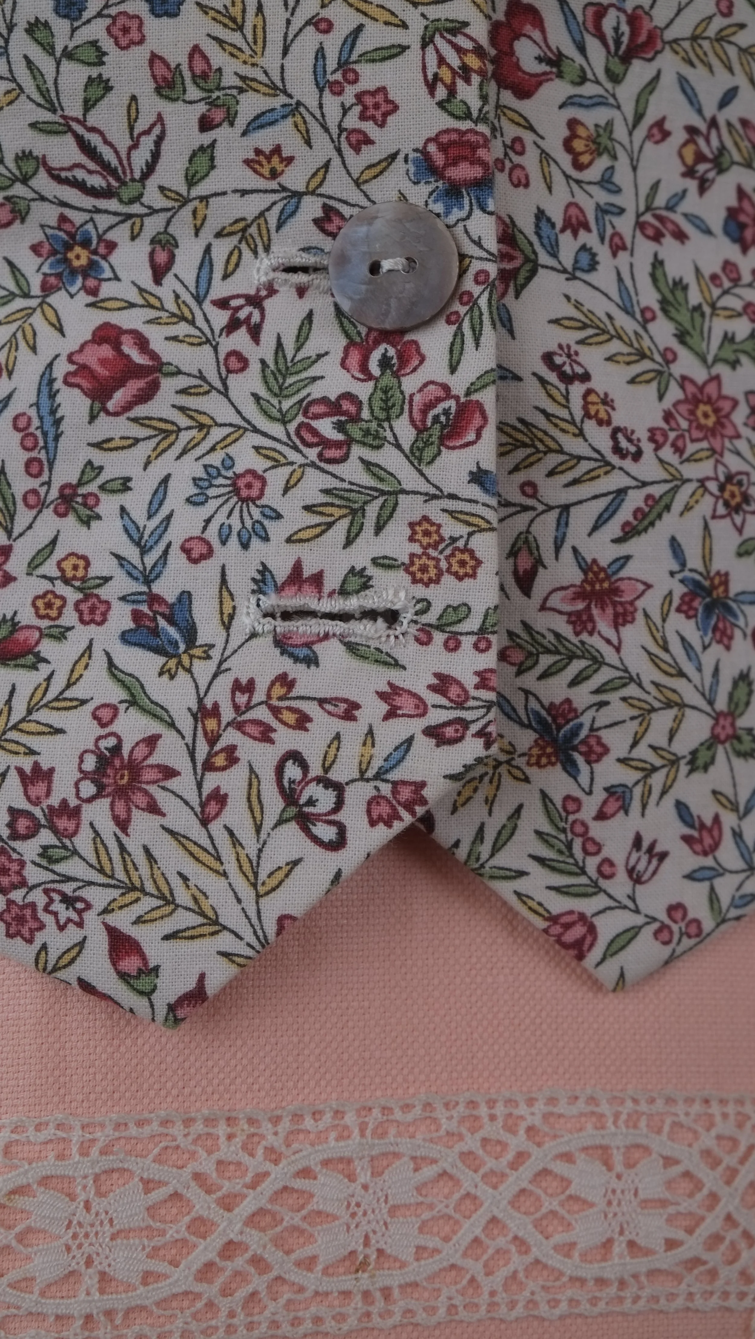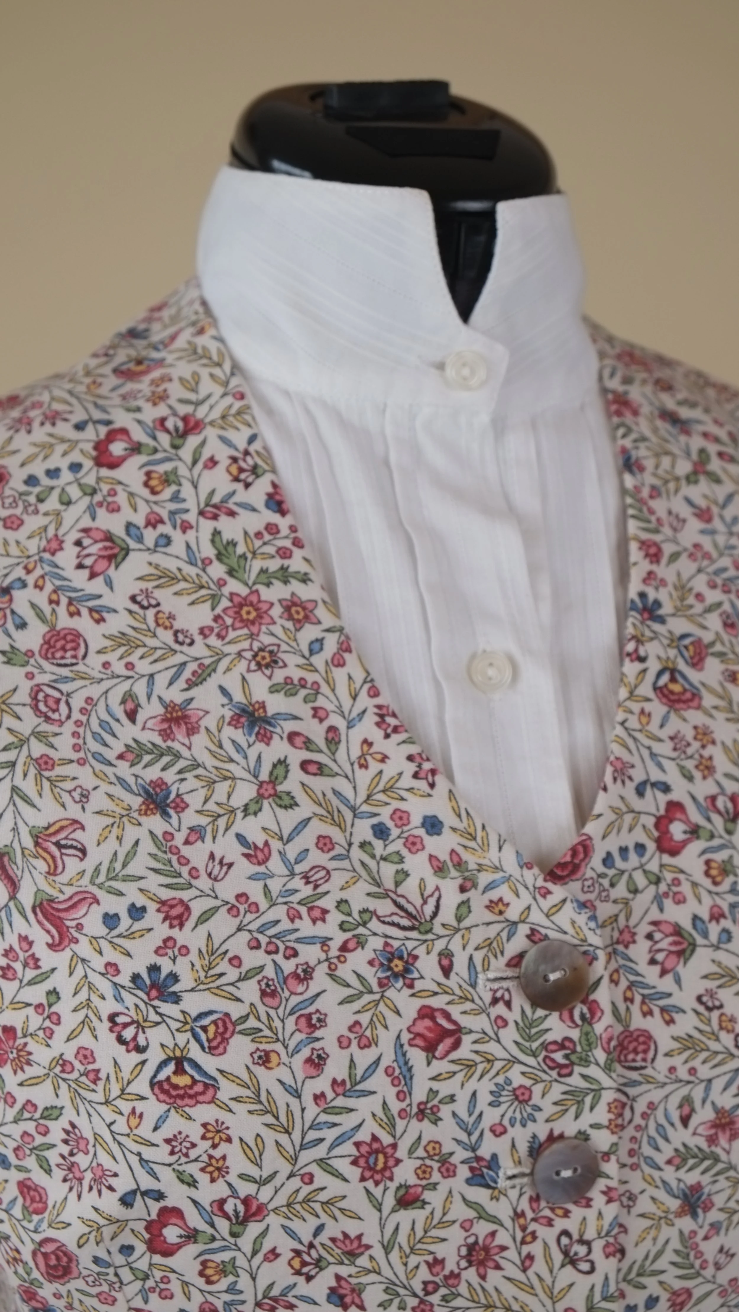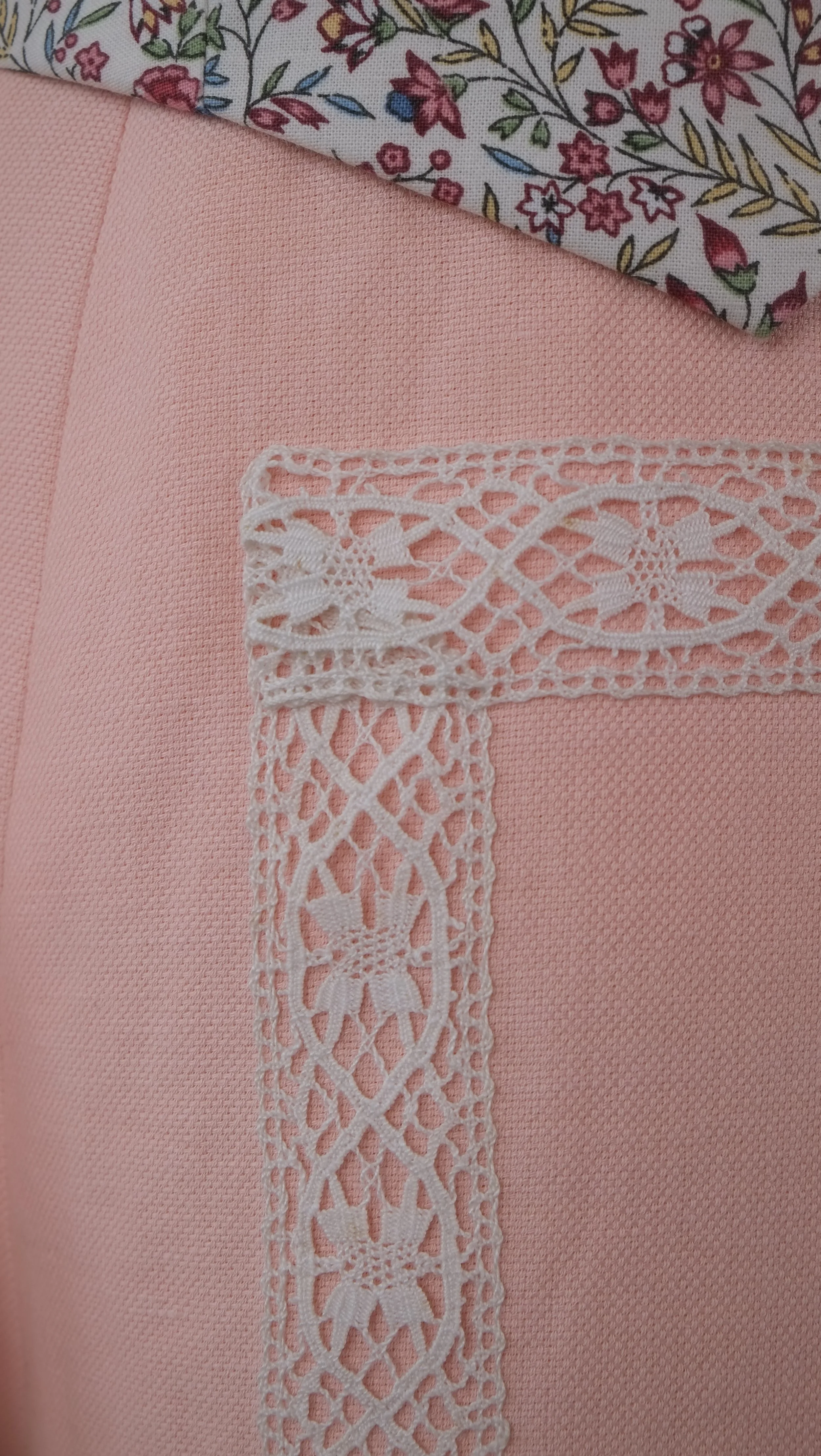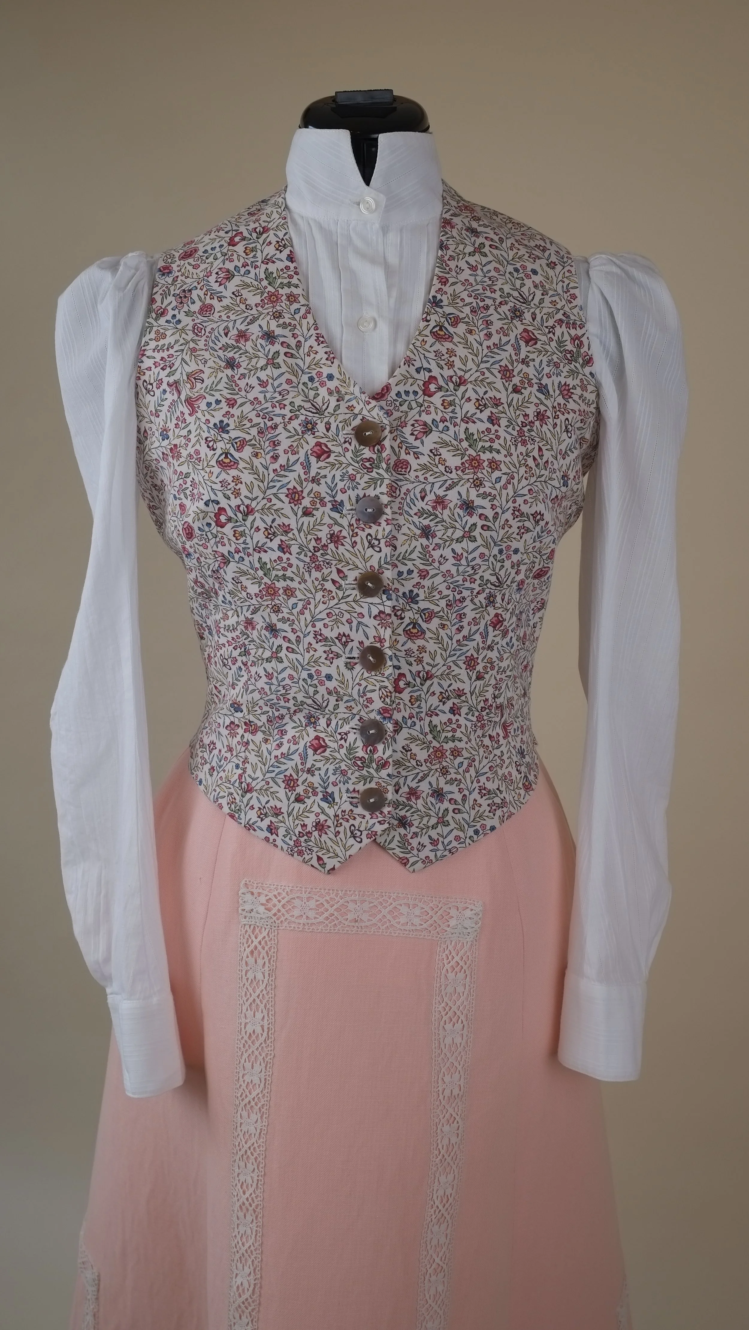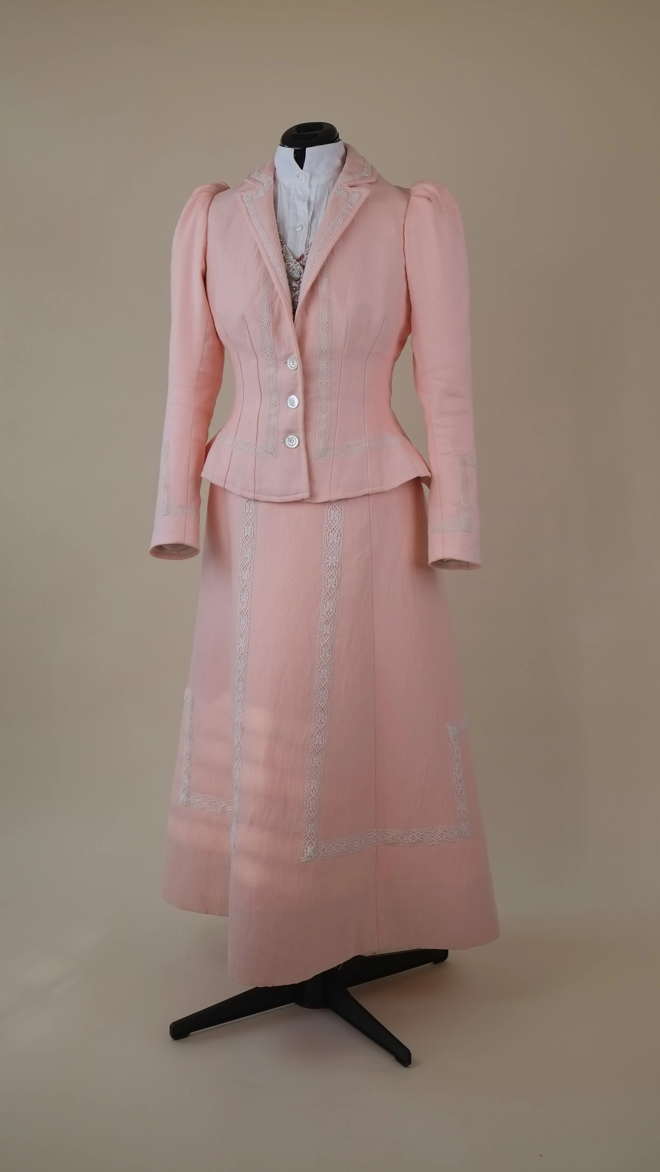 Bei den Jacken gab es eine Vielzahl verschiedener Stile zur Auswahl. Von kurzen offenstehenden bis hin zu wadenlangen Mänteln war alles zu finden. Ich habe mich hier für ein kürzeres Design entschieden. In meiner sommerlichen Variante eines Wanderensembles bestehen Jacke und Rock aus einem zart rosafarbenen Leinen. Beide Teile sind nur mit den nötigsten Verstärkungen und Polsterungen ausgestattet, um einen guten Sitz zu garantieren, ohne aber die Stücke allzu schwer zu machen. Die Weste und auch die Futterstoffe aller drei Stücke sind aus Baumwolle. Die Knopflöcher sind handgearbeitet und das ganze Ensemble ist mit antiker Spitze verziert.