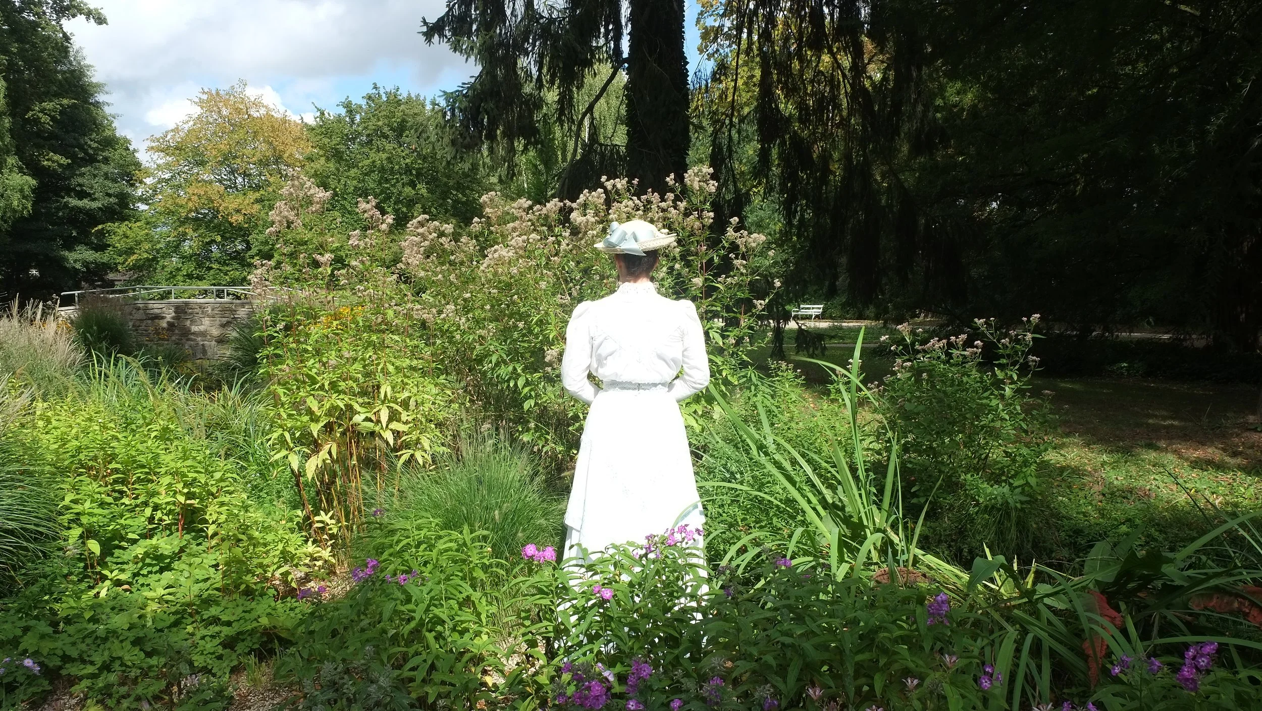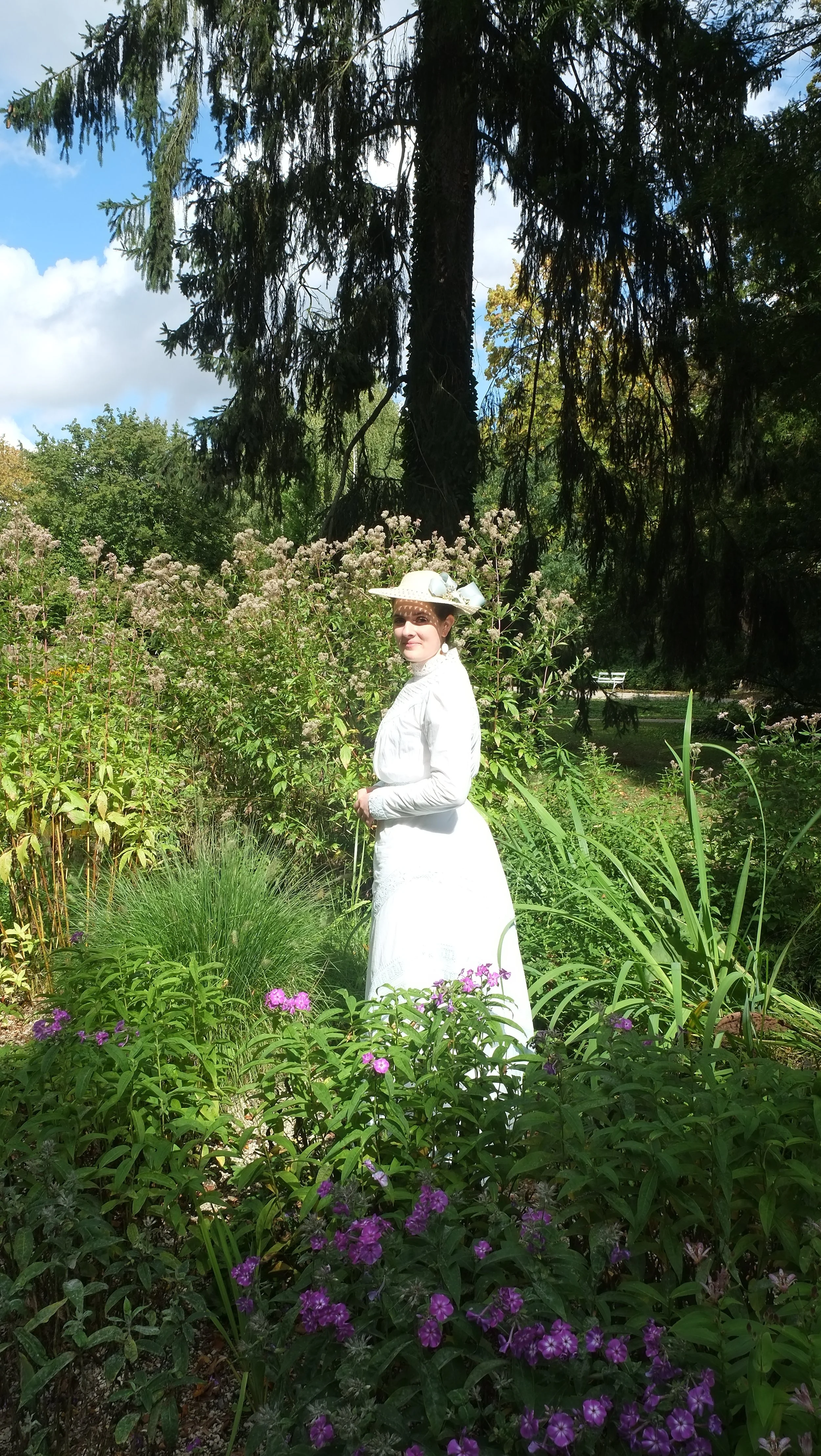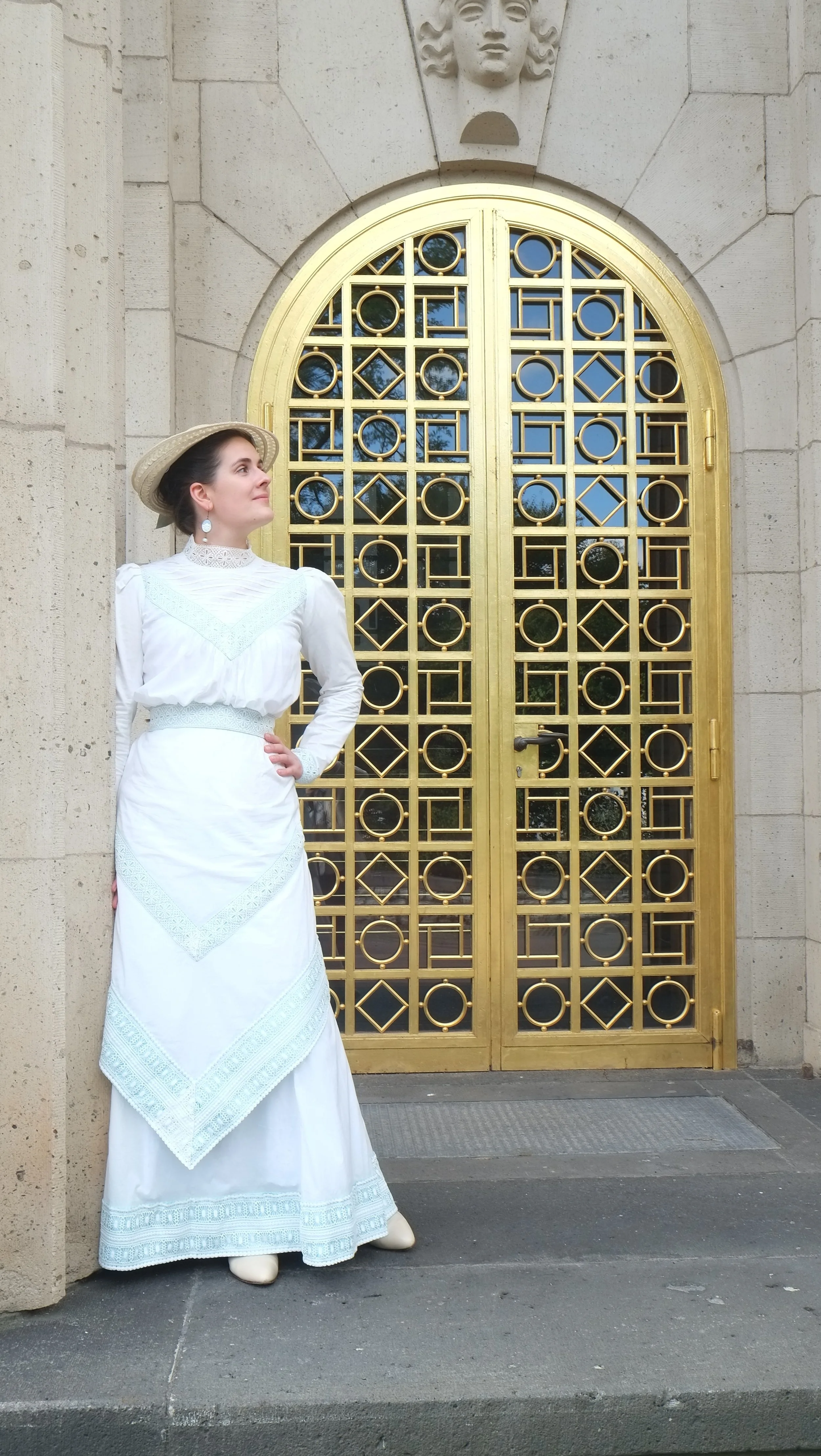 Dieses Kleid habe ich nach einer Modezeichnung aus dem V&A-Museum entwickelt. Auf dieser Zeichnung ist eine Dame mit einem Crocket-Schläger abgebildet, welcher uns auch den Anlass ein solches Kleid zu tragen verrät. Man sieht die sommerliche Gartenparty direkt vor sich, mit weißen Zelten auf frisch gemähtem Rasen…